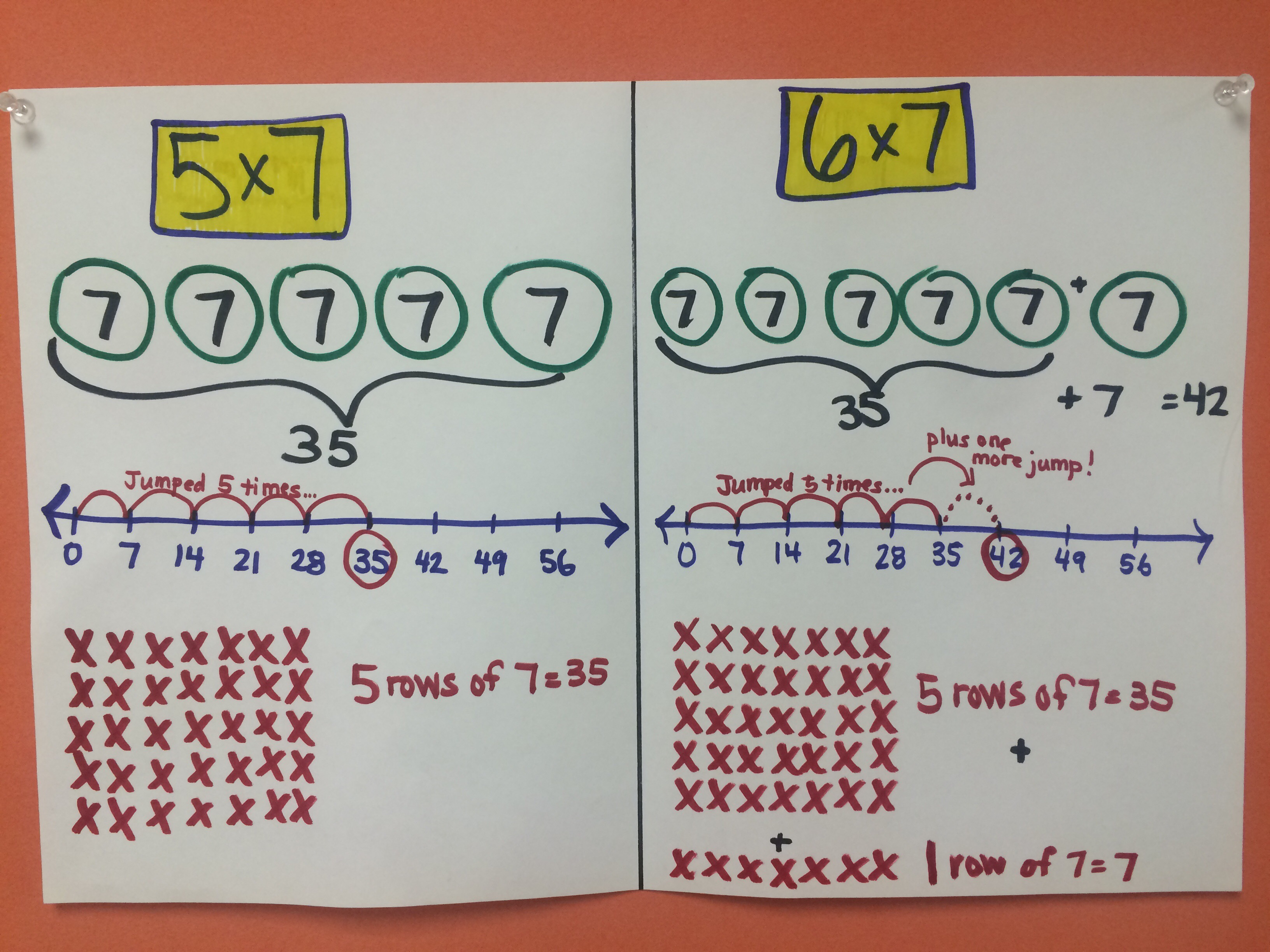 Drawing these visuals allowed my students to have something to connect multiplication to. Not only that, 6 x 7 is just one more group/row of 7! Eureka!