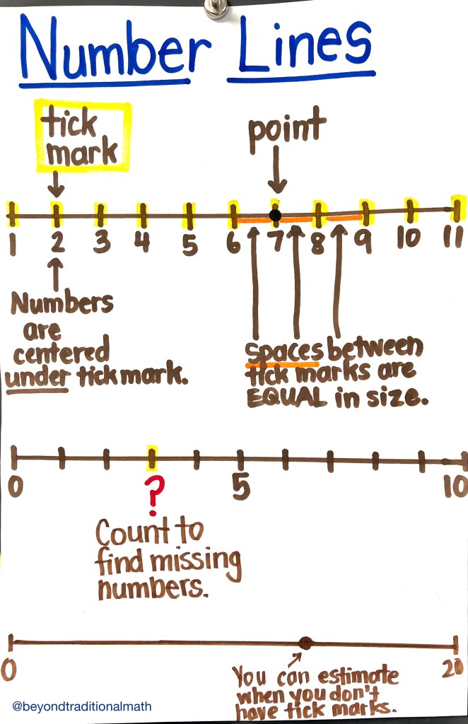 There are things on that anchor chart that every single adult takes for granted. We know what a tick mark is, we know what a point is, and we know what to do when numbers are missing. These are things that the majority of our students have never experienced. This anchor chart is especially important because number lines come up in so many concepts for many years to come.